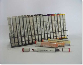 Marker adalah alat "wajib" bagi seorang desainer dalam melakukan pewarnaan. Ada beberapa merek yang tersedia di pasaran, yang paling umum adalah COPIC (Jepang) dan TRIA (Amerika). Tria memiliki kelebihan yaitu memiliki tiga pilihan ujung pena (nib) dalam satu pen : broad (lebar), fine, dan very fine (seperti ballpoint) . Sementara Copic hanya memiliki dua ujung : broad dan fine. Namun harga Tria juga lebih mahal, yaitu sekitar 70 ribu rupiah per buahnya. Agak susah mencari marker merek Tria ini, dulu saya pernah melihatnya ada yang menjual di toko buku Bintang Palapa (Surabaya), tapi pilihan warnanya sangat terbatas. Copic lebih mudah didapatkan, pilihan warnanya juga komplit (bisa anda download di sini). Selain penanya sendiri, marker juga tersedia dalam bentuk refill-nya, sehingga jika habis isinya kita tidak perlu membeli pena baru, cukup mengisinya kembali. Harga refill-nya hampir sama dengan harga penanya.